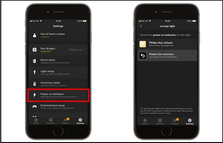 Khi cúp điện, chúng ta sẽ gặp khó khăn khi điều khiển bóng đèn Philips Hue trên ứng dụng như bạn sẽ phải canh lúc có điện để đi bật đèn. Chính vì vậy các nhà thiết kế của Signify đã thiết lập cho người dùng chế độ tự động bật sáng khi có điện trờ lại. Chế độ này là Power-on behavior nằm trong phần Settings.