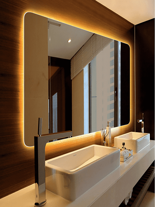 - Ánh sáng công việc: Là ánh sáng phục vụ cho từng công việc cụ thể như trang điểm, cạo râu, hay thư giãn,... Bạn nên lắp bóng đèn vào 2 bên cạnh hoặc xung quanh gương (như hình) để ánh sáng có thể chiếu rõ gương mặt bạn mà không bị khuất bóng. Loại đèn phù hợp để viền xung quanh gương là LED dây bởi tính linh hoạt dễ uống lượn theo từng góc cạnh.