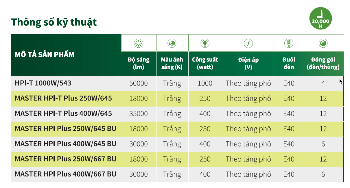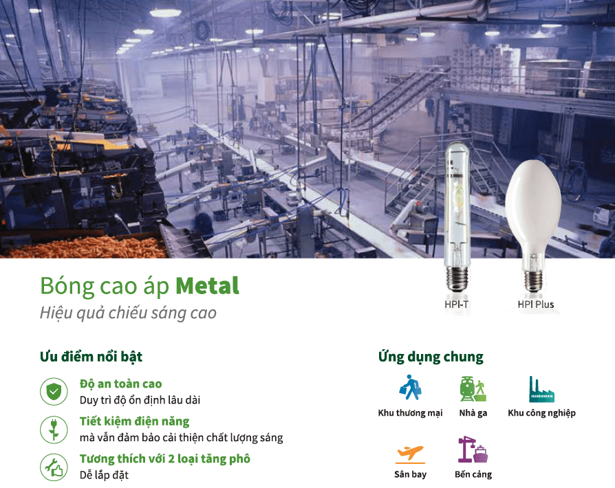 Bóng cao áp Philips 400W Metal Halide bao gồm chủng loại HPI Plus và HPI-T Plus dùng trong chiếu sáng công nghiệp, rọi pha, chiếu sáng ngoài trời và những sàn thi đấu thể thao. Bóng đèn cao áp Metal Halide Philips HPI-T 400W có hình ống trong suốt hoạt động được với bộ đèn cao áp Philips bóng HPI, bóng SON và cần có kính che bảo vệ. Bóng cao áp Philips Metal Halide HPI-T Plus 400W dùng hỗn hợp muối 3 chất, bảo đảm tuổi thọ bền lâu, chỉ số màu cao và khả năng duy trì màu cực tốt so với bóng dùng hỗn hợp NASc, bóng này có độ thay đổi màu ít hơn rất nhiều.