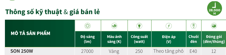 Thông số kỹ thuật của bóng đèn cao áp Philips Sodium dạng bầu SON 250W E E40 CO SVL/12