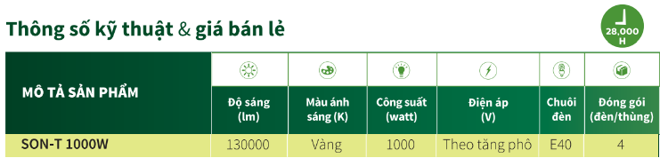 Thông số kĩ thuật và giá bán lẻ cùa bóng đèn cao áp SON-T 1000W E E40 SL/12