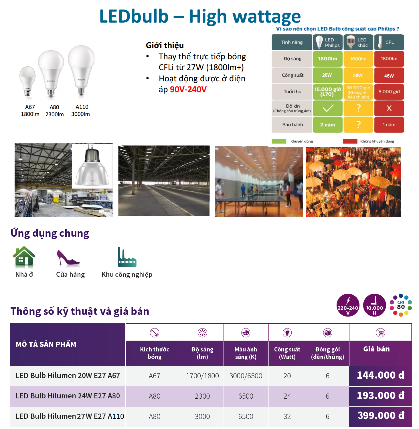 Chuyển đổi sang sử dụng Bóng đènLEDBulb công suất cao Philips thay thế cho các loại bóng đèn Compact CFL công suất lớn truyền thống, với hiệu quả tiết kiệm đến 60% năng lượng cắt giảm chi phí tiền điện hàng tháng cho người tiêu dùng.