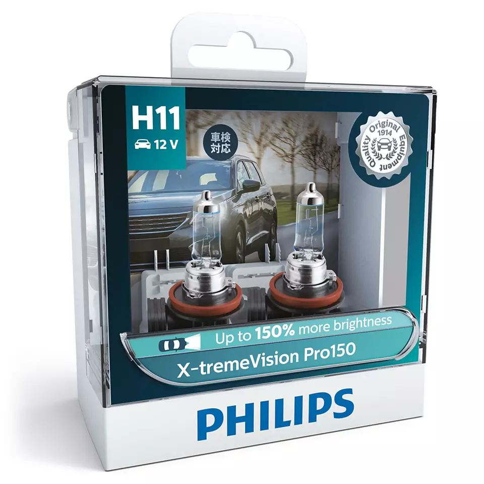 Bóng đèn pha ô tô Philips Halogen X-treme Vision Pro150 H11 12362 XVP 12V 55W PGJ19-2 S2 tăng sáng 150%, ánh sáng 3450K được làm từ thủy tinh thạch anh chống tia tử ngoại (UV) có tính năng lọc các tia tử ngoại có hại có thể làm ố vàng các thiết bị đèn pha bằng nhựa hiện đại, đồng thời cung cấp thêm ánh sáng cùng với tính năng chống xóc tốt hơn trên đường đi.