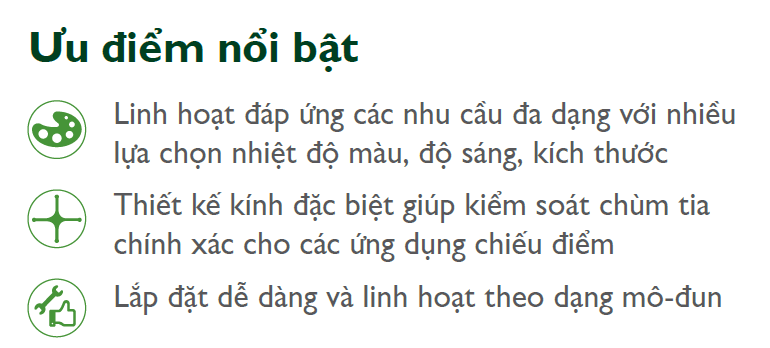 Hiệu ứng ánh sáng chiếu điểm tập trung nguồn sáng vào những nơi cần chiếu tới mang đến sự lộng lẫy và rực rỡ cho không gian chiếu sáng từ sãnh đến phòng, từ hành lang cho đến các hội trường.