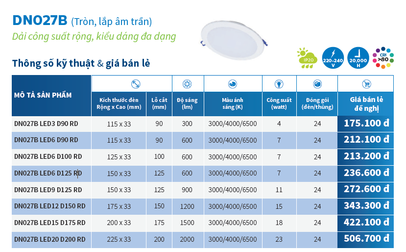 Dưới đây là một số thông tin kỹ thuật và giá bán các dòng Bộ đèn downlight LED DN027B LED9 D125 RD 10W bạn có thể tham khảo thêm nha !!