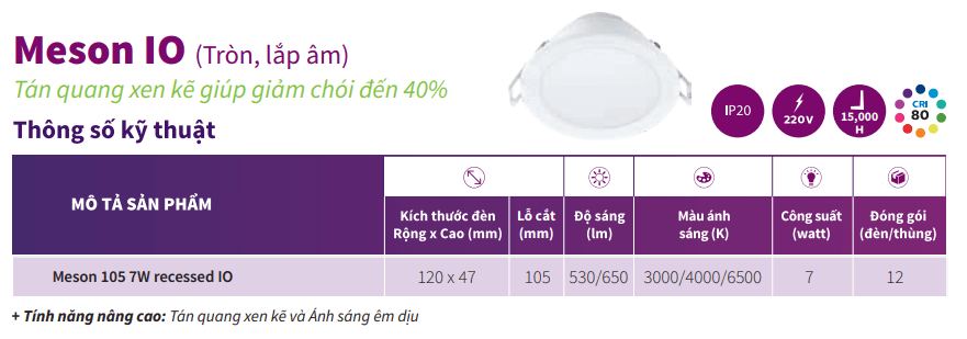 Ưu điểm vượt trội của bộ đèn LED Downlight âm trần giảm chói Philips 59448 Meson 105 7W 40K recessed IO: