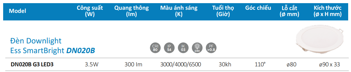 Thông số kỹ thuật của Đèn downlight âm trần LED Philips DN020B G3 LED3/CW 3.5W 220-240V D80 GM