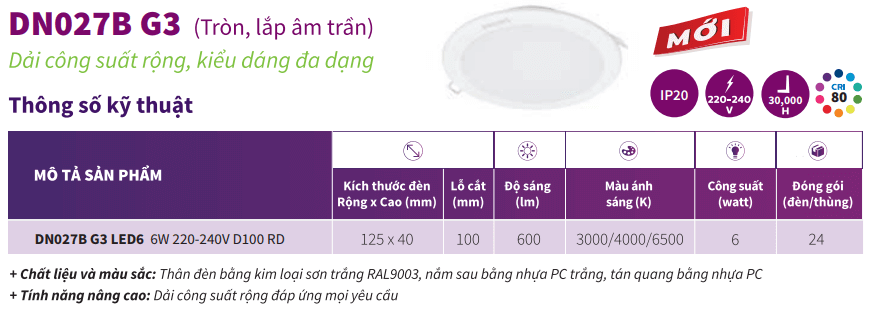 – Đa dạng lựa chọn: Có nhiều mức công suất và nhiệt độ màu để lựa chọn, từ 6W đến 19W và từ 3000K đến 6500K.