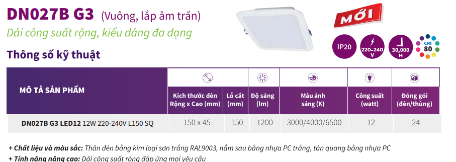 Thông số kĩ thuật đèn LED Philips vuông downlight âm trần DN027B G3 LED12/NW 12W 220-240V L150 SQ