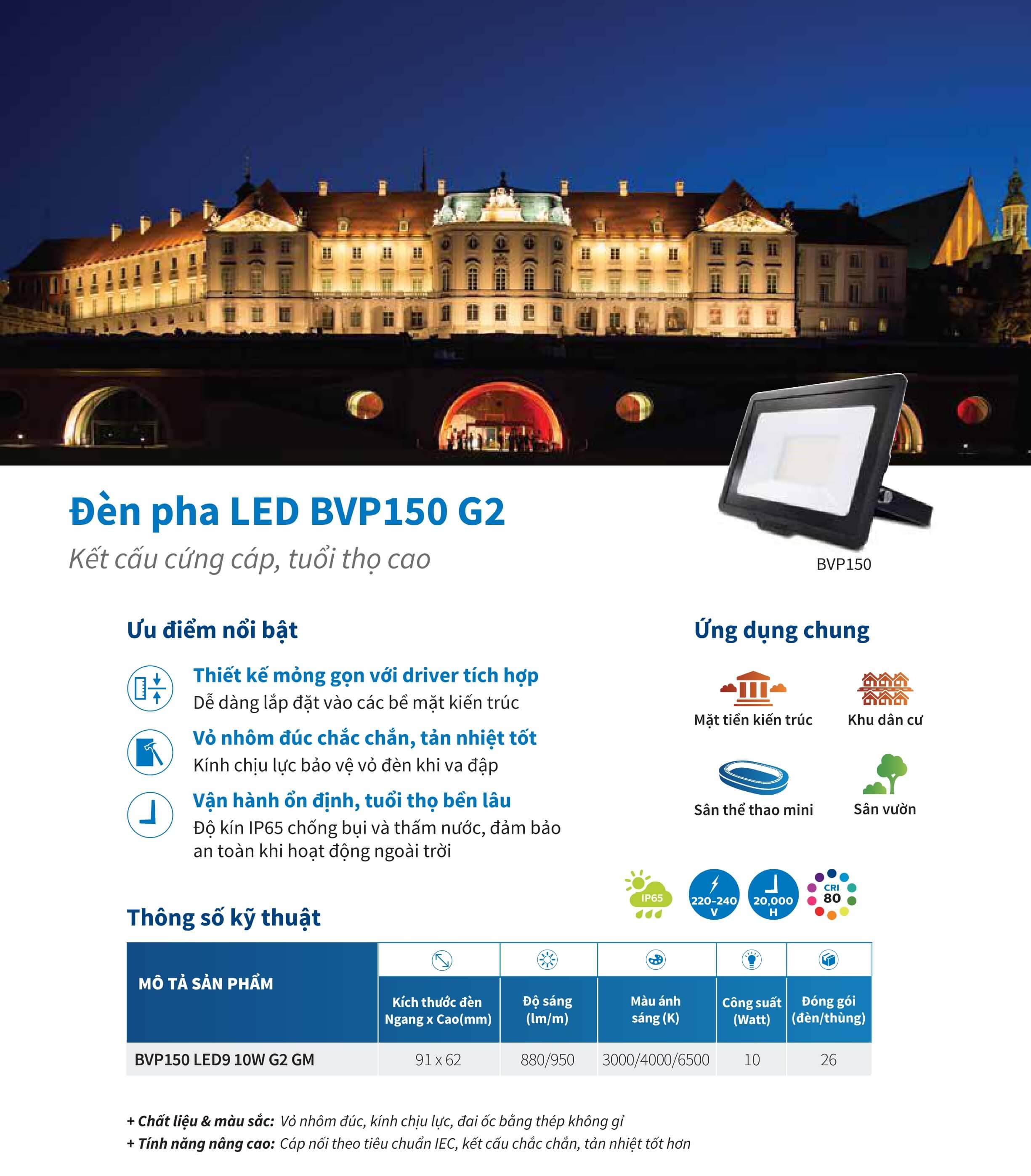 Đèn pha LED Philips BVP150 10W Essential SmartBright G3 LED Floodlight LED9 220-240V SWB CE phục vụ cho nhiều mục đích chiếu điểm và chiếu sáng chung trong các nhu cầu chiếu sáng những không gian lớn ngoài trời, bảng hiệu quảng cáo, quảng trường, công trình, sân vận động, cầu cảng hoặc làm nổi bật cảnh quan, sân vườn không gian quanh nhà và đảm bảo an ninh vào ban đêm khách sạn, cửa hàng bán lẻ và gia đình.