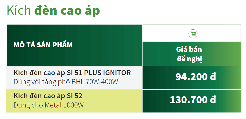 Kích đèn cao áp Metal Halide Philips SI51 kết hợp với bóng đèn cao áp Metal Philips HPI-Plus, tăng phô (Ballast/ Chấn lưu) điện từ đèn cao áp Metal halide Philips BHL, tụ điện cao áp Philips và chóa đèn cao áp để tạo thành một bộ đèn cao áp hòan chỉnh.