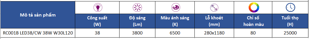 Thông số kỹ thuật của máng đèn âm trần dạng tấm Led Panel Philips RC001B LED38/CW 38W W30L120