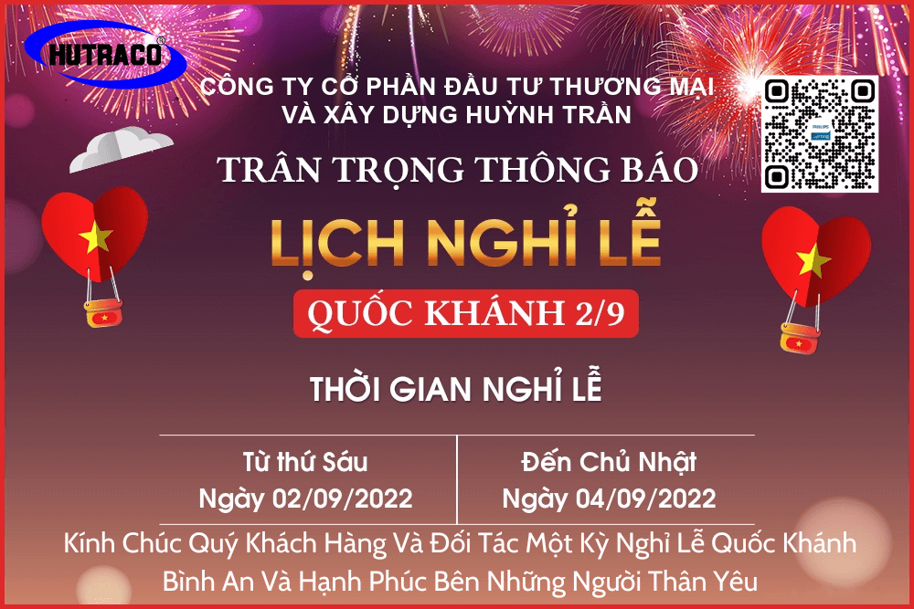 Để Quý khách hàng thuận tiện liên lạc trong thời gian nghỉ Lễ Quốc Khánh 02/09/2022 Huỳnh Trần xin thông báo về lịch nghỉ Lễ như sau: